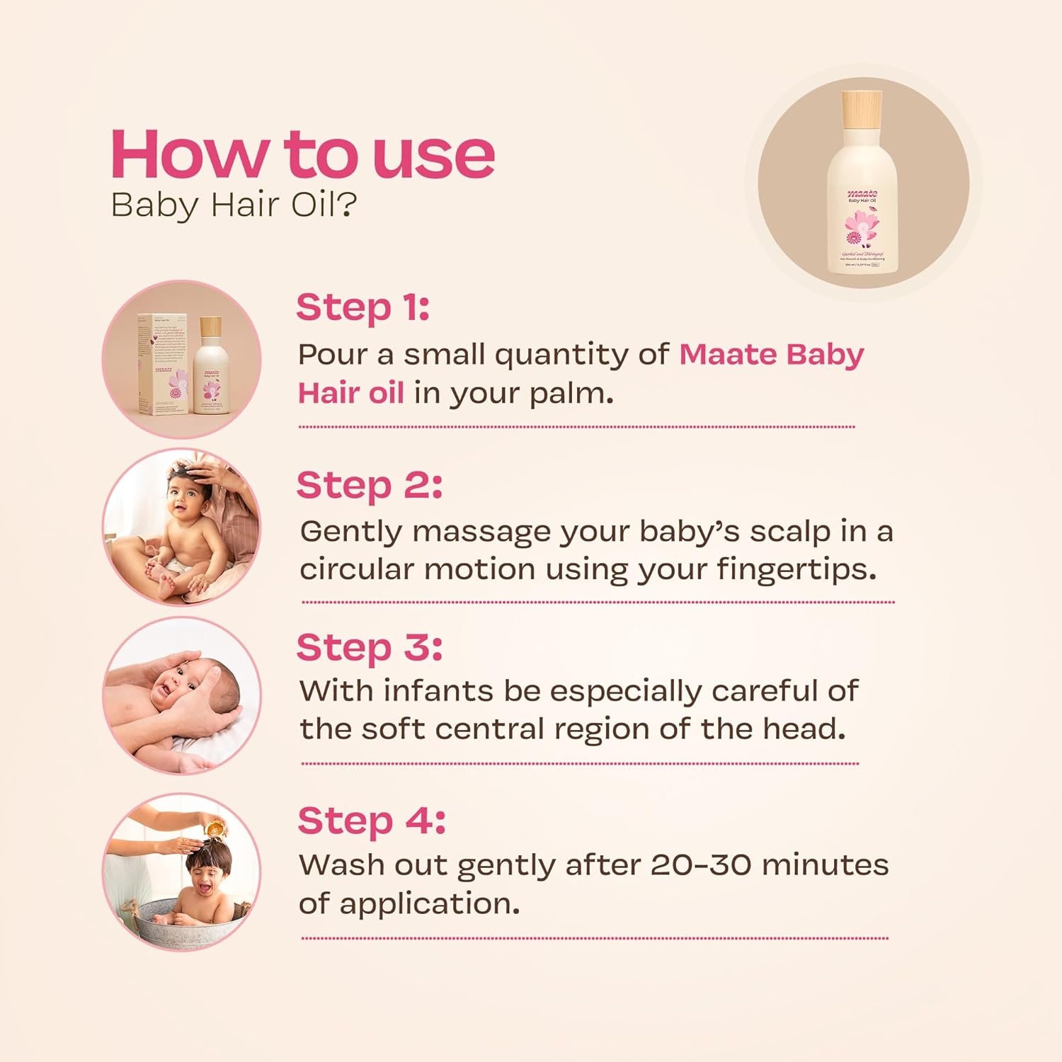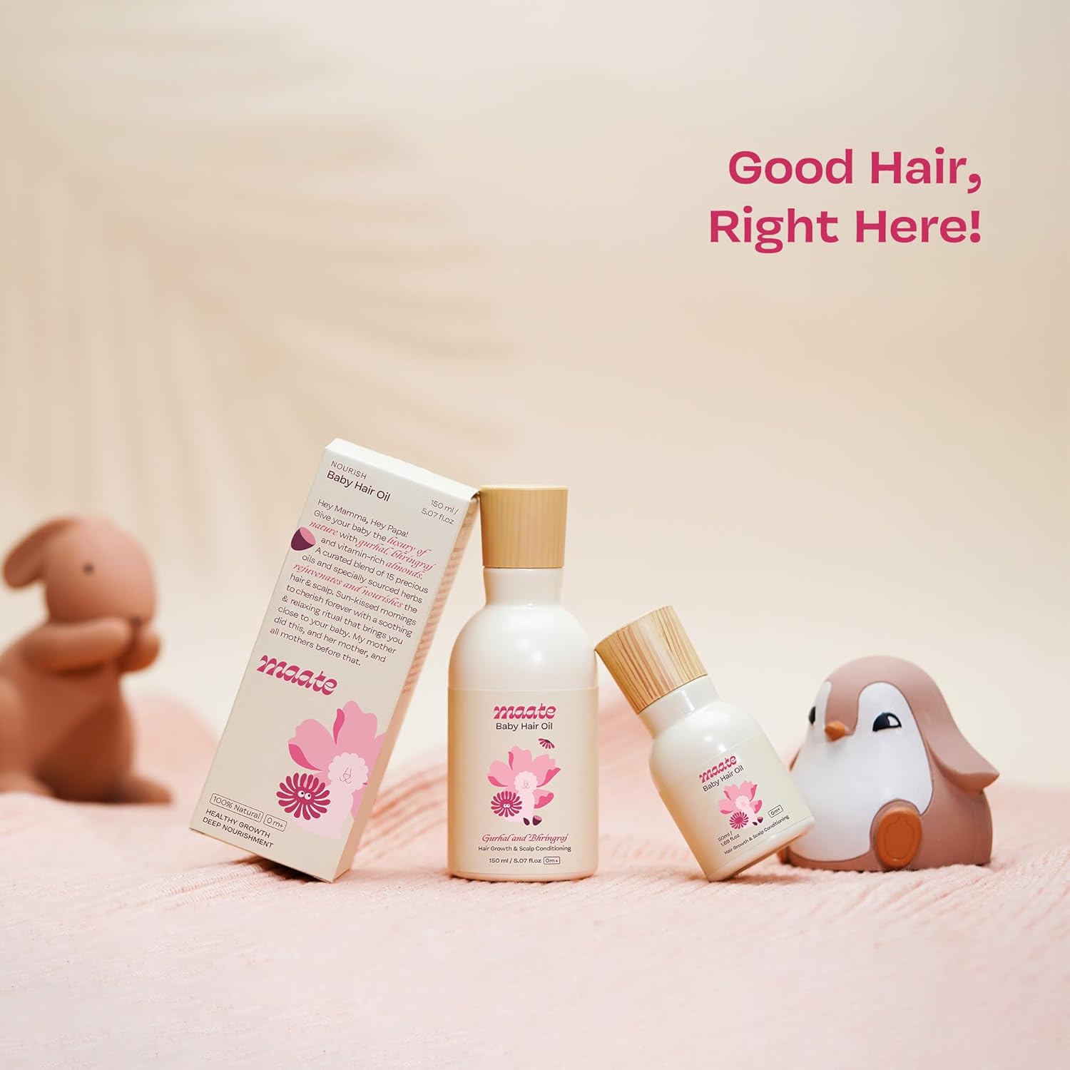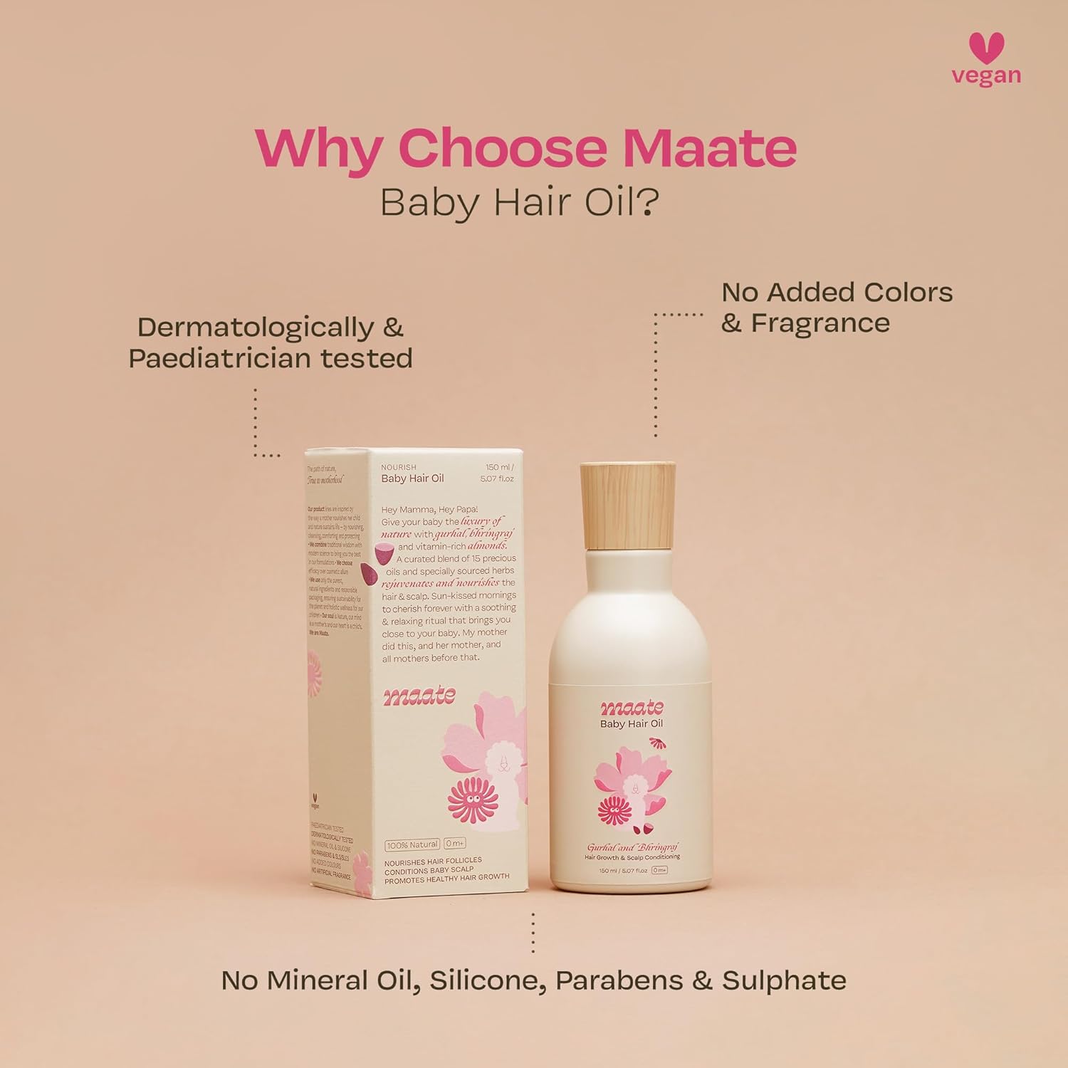 Rooted in Nature: Maate’s formulation celebrates purity and transparency. With ingredients like sesame oil, almond oil, hibiscus flower extract, moringa seed oil, and pongamia pinnata extract, each component is handpicked for its nurturing properties and skin-soothing benefits. Dermatologically tested and vegan, this baby hair oil is crafted with care, so you can trust what you’re using on your child’s delicate skin.