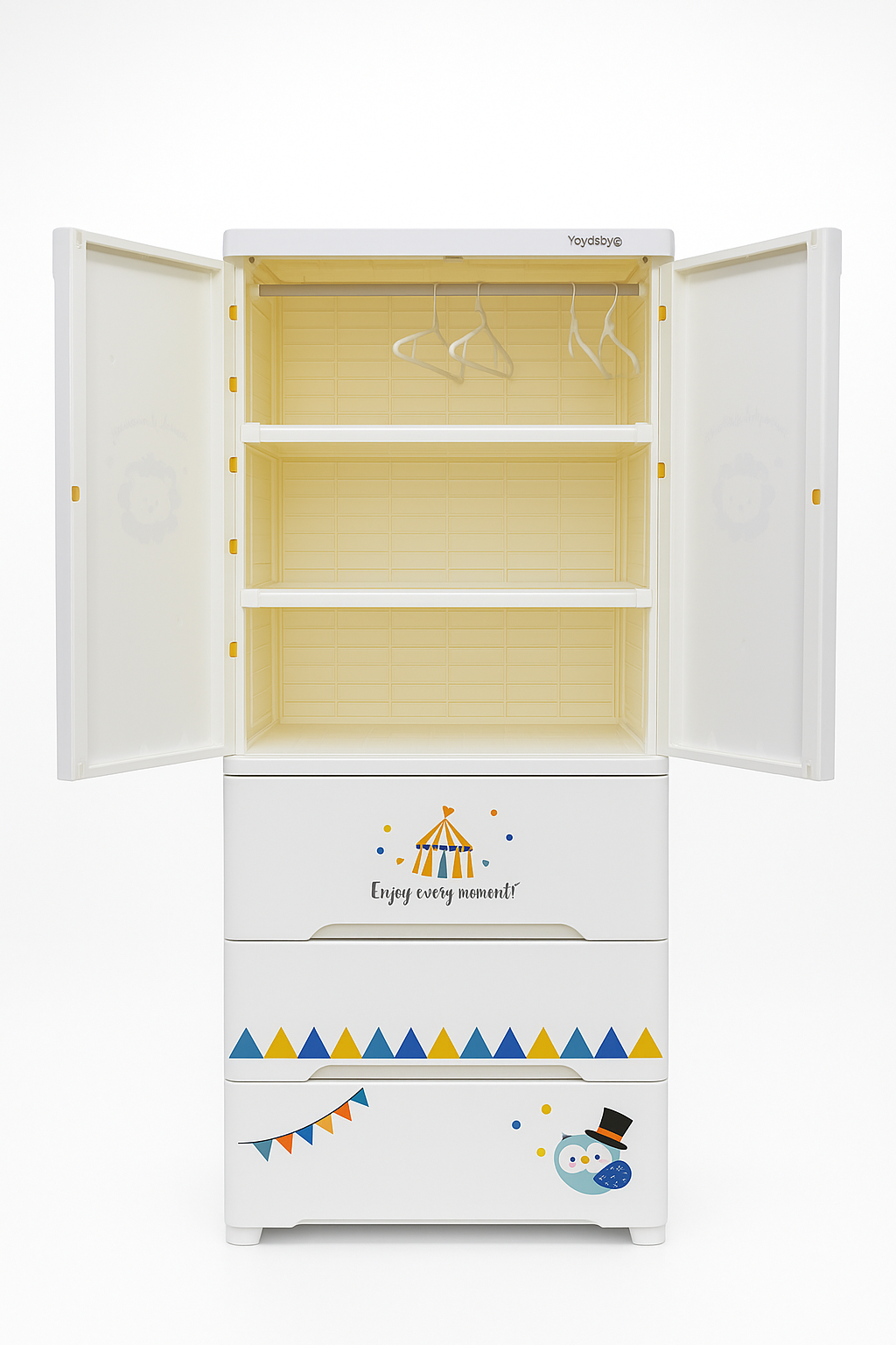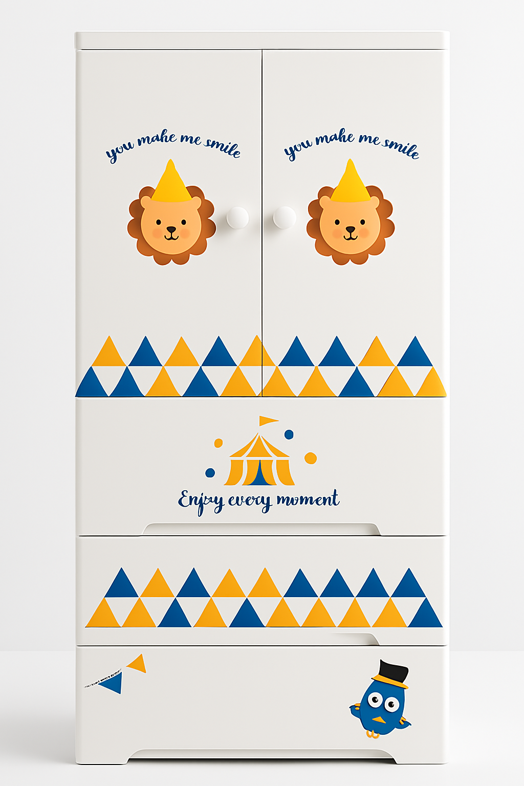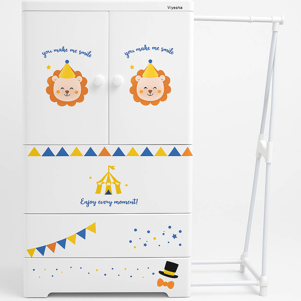 The Viyesha Kids Wardrobe brings joy and functionality together with its charming lion-themed design and circus illustrations. With ample storage and an easy-to-clean, child-safe build, this multi-functional cupboard is a perfect fit for any nursery, playroom, or kid’s bedroom.