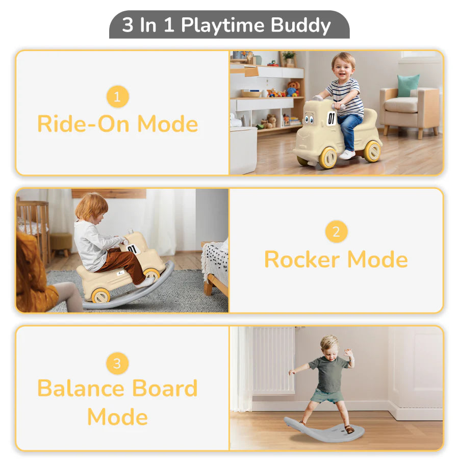 Unleash the joy of movement and learning with the Rock N Ride 3-in-1 Playtime Buddy—an innovative ride-on toy designed to grow with your child. Crafted from BPA-free, non-toxic PP material, this versatile product seamlessly transforms into a balance board, ride-on, and rocker, offering endless hours of safe, skill-building fun.